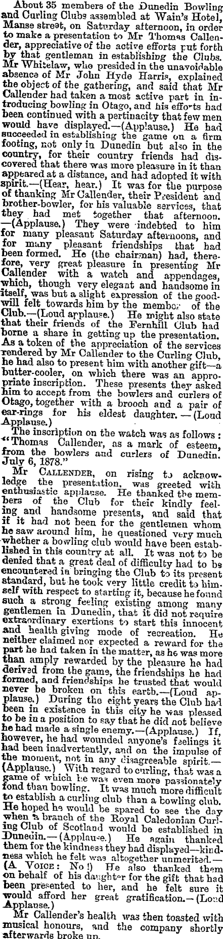 In 1873 Thomas Callender, the "father of New Zealand curling", formed the Dunedin Curling Club, the earliest club that still plays today.